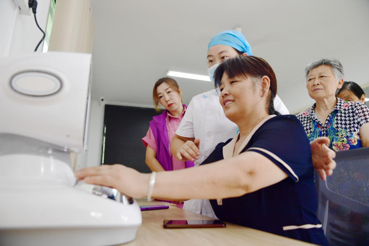 An AI-driven robot provides a free clinic to residents in Weilou neighborhood, Jinggang township, Hefei, east China's Anhui province. (People's Daily Online/Hu Zhaoqun)