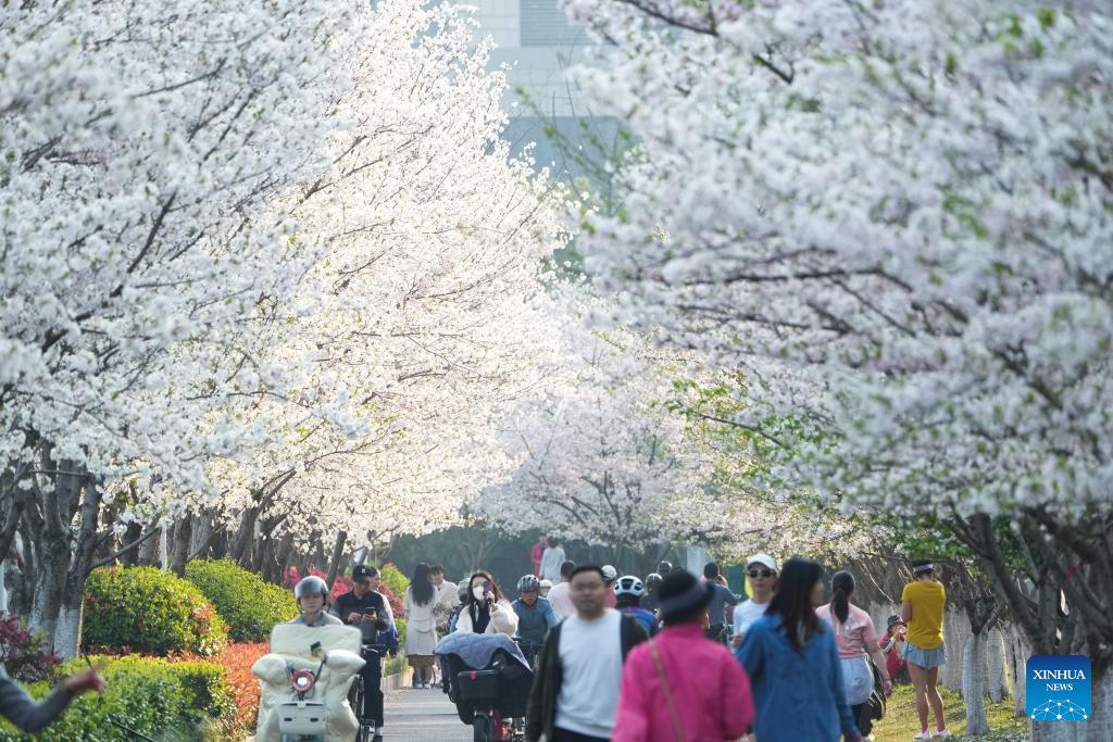 People walk under blooming cherry blossoms in Hangzhou, east China's Zhejiang Province, March 26, 2025. More than 3,000 cherry trees are in full bloom currently along Wentao Road in Binjiang District of Hangzhou, becoming a new attraction of the city. (Xinhua/Weng Xinyang)