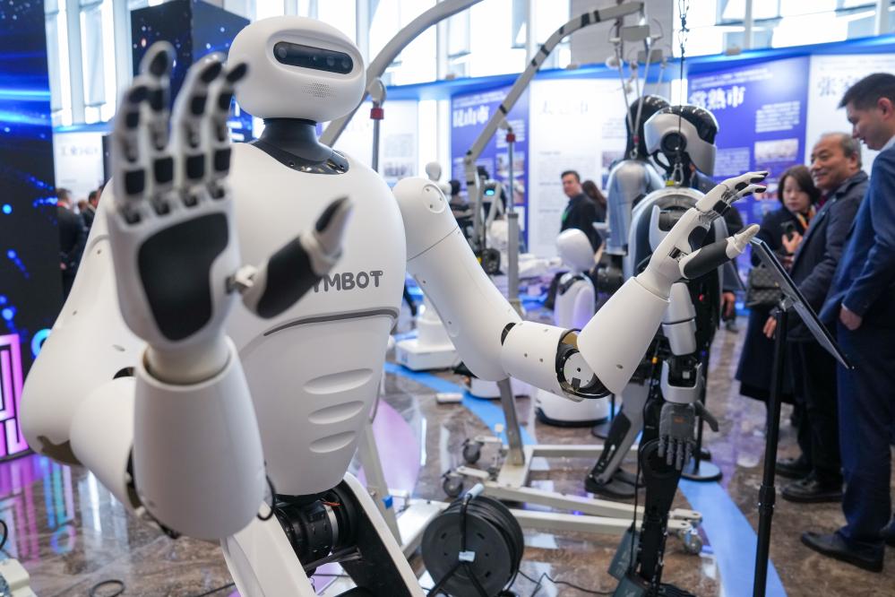 A humanoid robot is pictured during an innovative development promotion conference focusing on artificial intelligence in Suzhou City, east China's Jiangsu Province, Feb. 14, 2025. (Xinhua/Li Bo)