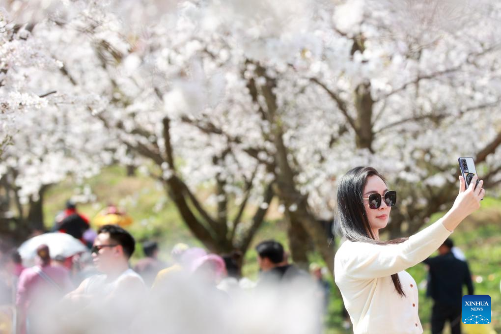 A visitor poses for selfies at a cherry garden in Gui'an New Area, southwest China's Guizhou Province, March 25, 2025. Recently, the 10,000 mu of cherry trees in Gui'an New Area have been in full bloom, attracting many tourists to come and enjoy the spring time.