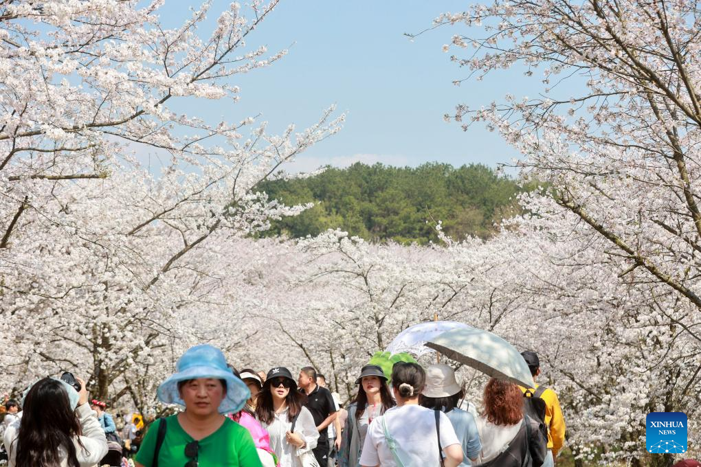 Tourists view cherry blossoms at a cherry garden in Gui'an New Area, southwest China's Guizhou Province, March 25, 2025. Recently, the 10,000 mu of cherry trees in Gui'an New Area have been in full bloom, attracting many tourists to come and enjoy the spring time.