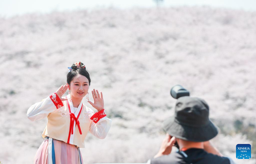 A visitor poses for photos at a cherry garden in Gui'an New Area, southwest China's Guizhou Province, March 25, 2025. Recently, the 10,000 mu of cherry trees in Gui'an New Area have been in full bloom, attracting many tourists to come and enjoy the spring time.