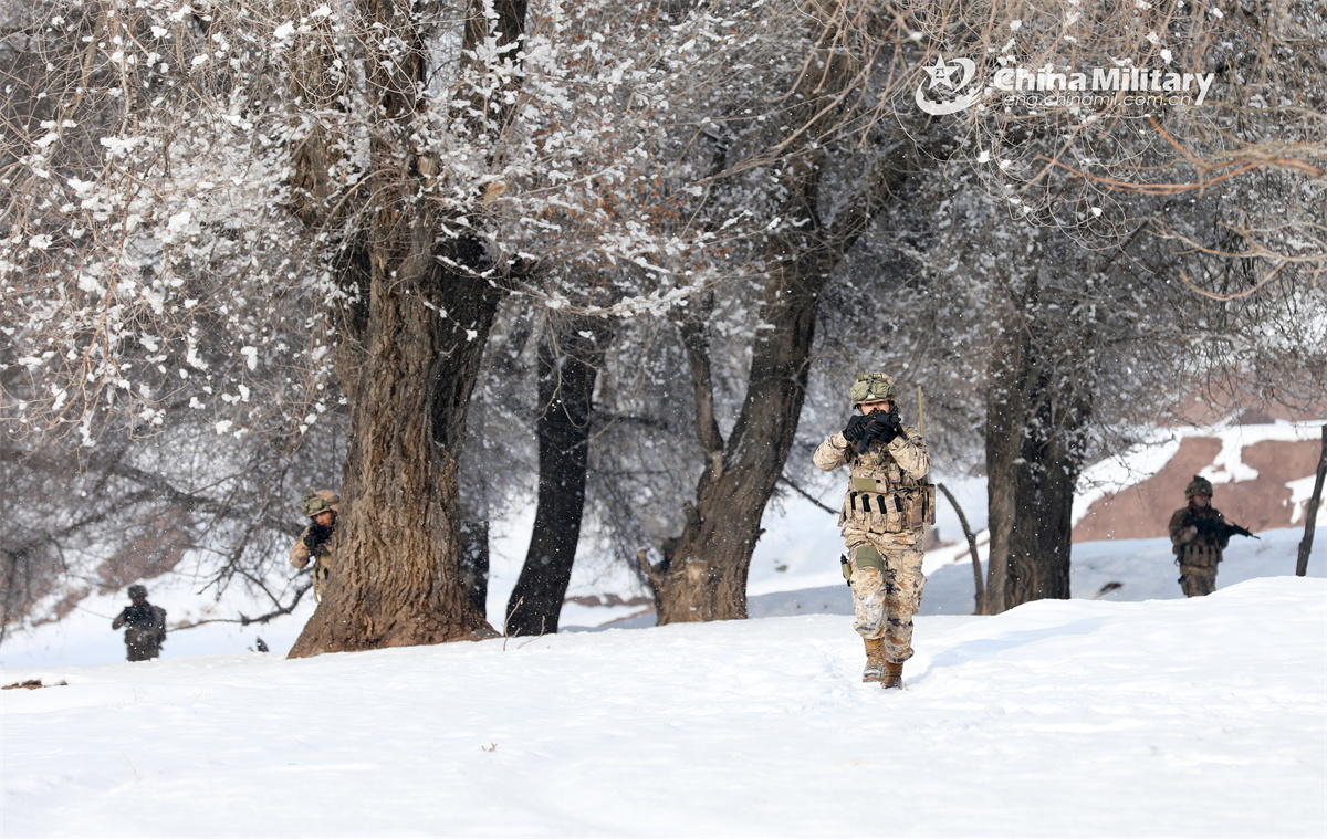 Soldiers assigned to a reconnaissance detachment of a regiment under the Chinese PLA Xinjiang Military Command pass through woods in combat formation during a multi-subject training exercise on February 24, 2025. (eng.chinamil.com.cn/Zhang Shihong)