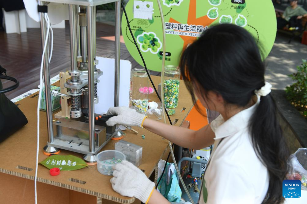 A staff member demonstrates the plastic recycling process at the Boao zero-carbon demonstration zone during the Boao Forum for Asia (BFA) Annual Conference 2025 in Boao, south China's Hainan Province, March 25, 2025. Since its formal inauguration in 2001, the BFA has served as a key platform for the advancement of green development across Asia, facilitating the exchange of insights to promote sustainable growth in the region and beyond.