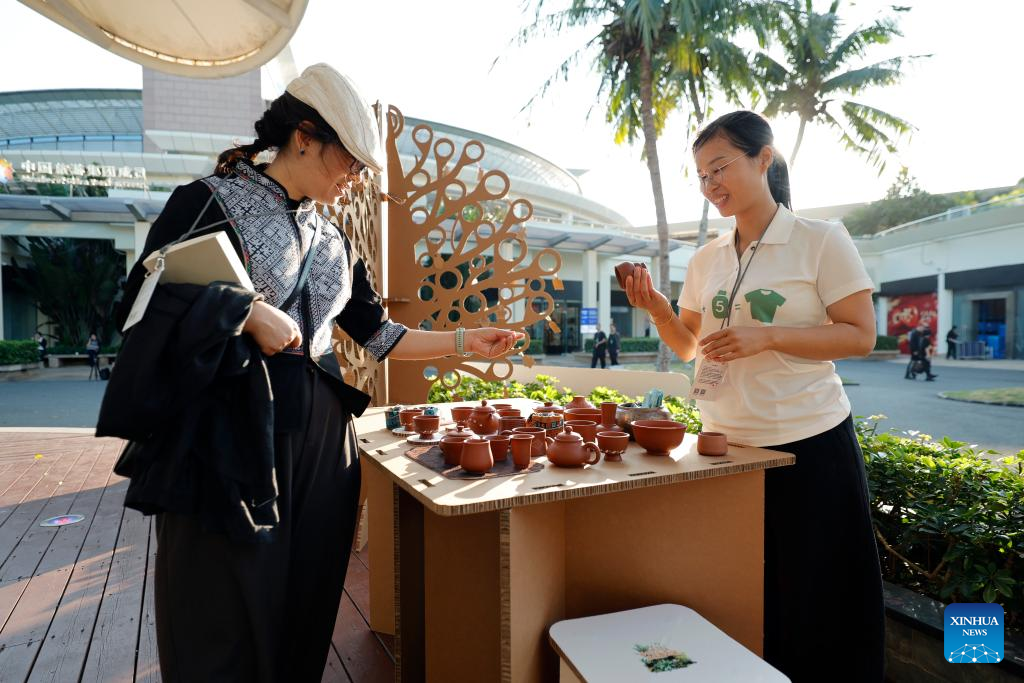 A staff member shows tea products certified for carbon neutrality during the Boao Forum for Asia (BFA) Annual Conference 2025 in Boao, south China's Hainan Province, March 26, 2025. Since its formal inauguration in 2001, the BFA has served as a key platform for the advancement of green development across Asia, facilitating the exchange of insights to promote sustainable growth in the region and beyond.