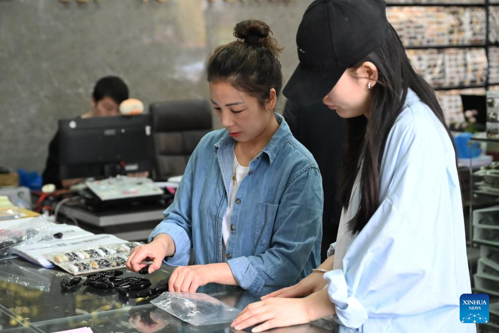 A staff member packs buttons for a customer at a button stall in Qiaotou Town of Yongjia County, Wenzhou City, east China's Zhejiang Province, March 26, 2025.
