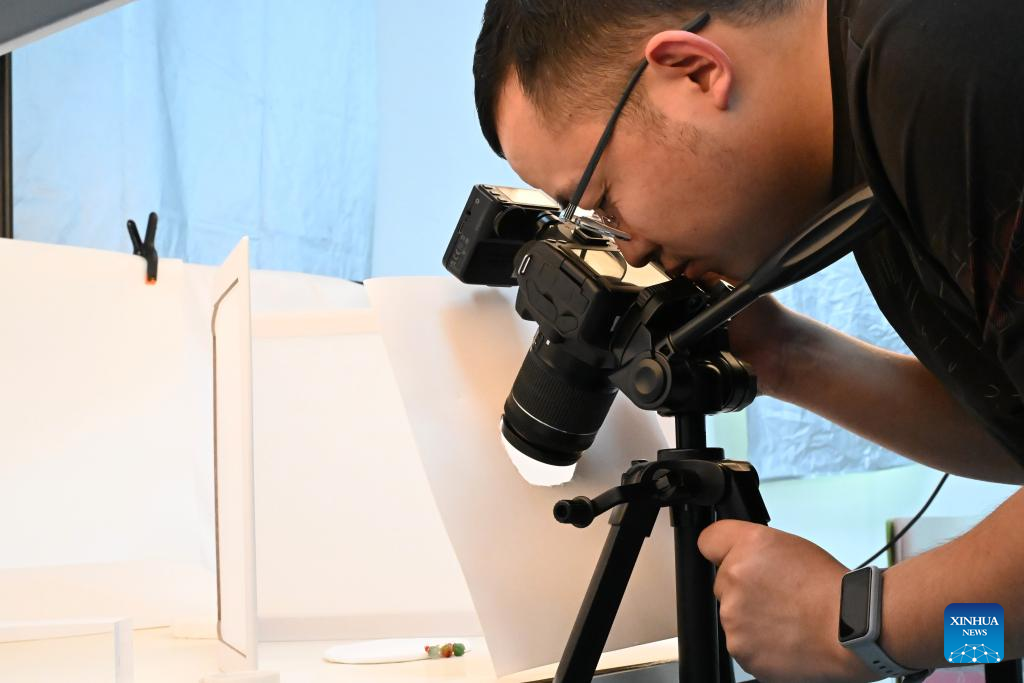A staff member takes advertising photos for buttons at a button company in Qiaotou Town of Yongjia County, Wenzhou City, east China's Zhejiang Province, March 26, 2025.