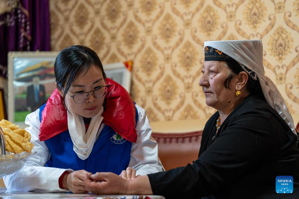 Zhang Qiang (R), a physician from Shenzhen, takes the pulse of a villager at Kukexiluge health center in Kukexiluge Township, Taxkorgan Tajik Autonomous County, northwest China's Xinjiang Uygur Autonomous Region, March 24, 2025. (Xinhua/Hu Huhu)