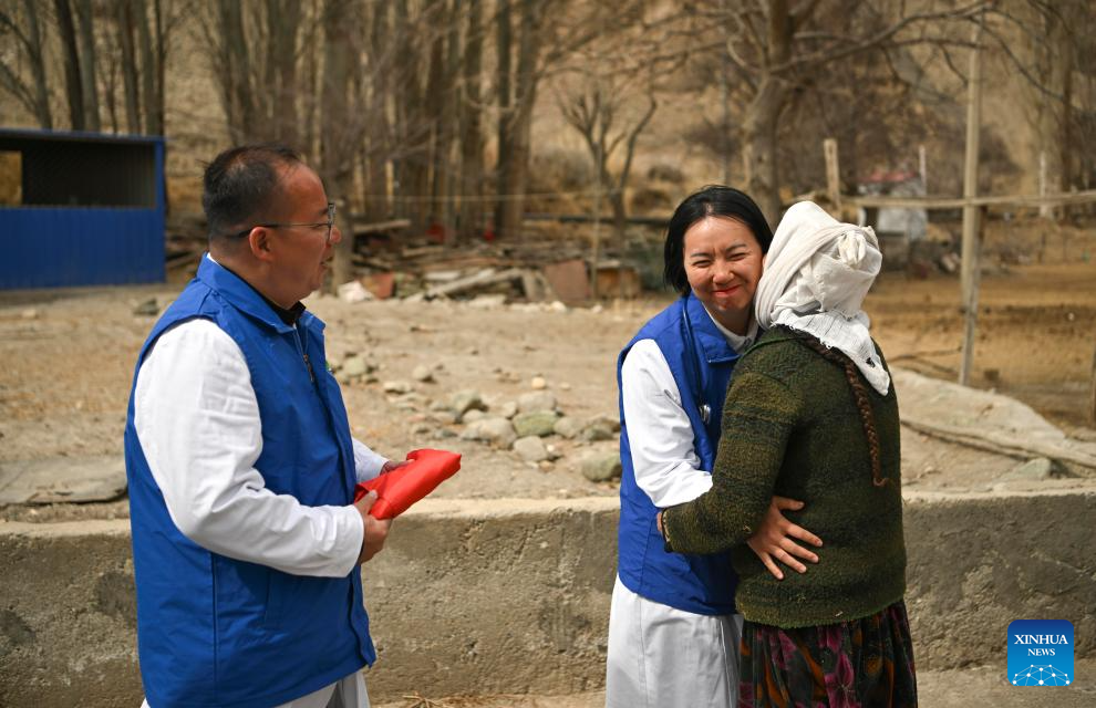 Doctors from Shenzhen make a home visit to an elder in Wayaoben Village of Kukexiluge Township, Taxkorgan Tajik Autonomous County, northwest China's Xinjiang Uygur Autonomous Region, March 24, 2025. (Xinhua/Hu Huhu)
