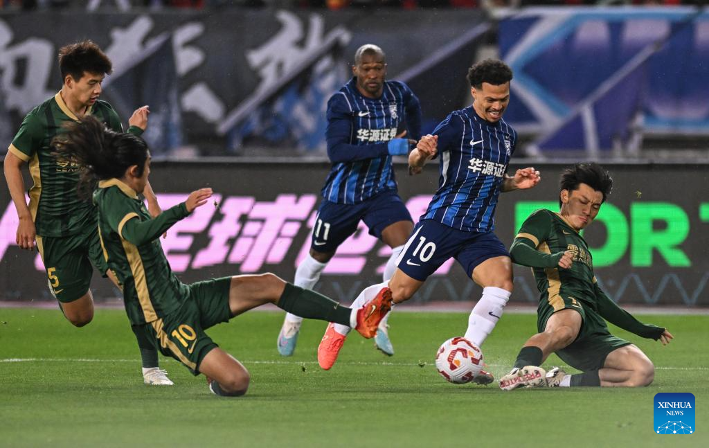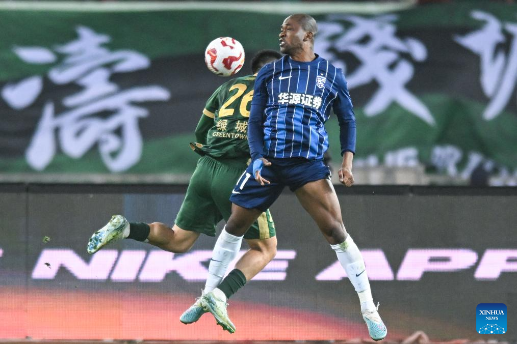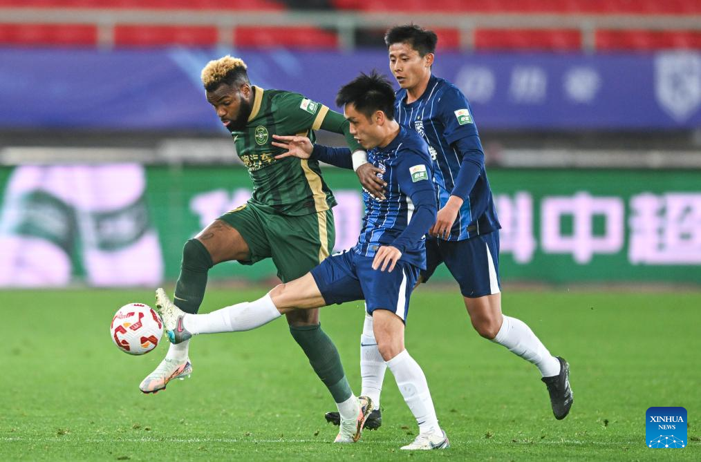 Darlan (2nd R) of Wuhan Three Towns FC breaks through during the 3rd round match between Wuhan Three Towns FC and Zhejiang Greentown FC at the 2025 season Chinese Football Super League (CSL) in Wuhan, central China's Hubei Province, March 28, 2025. (Xinhua/Cheng Min)