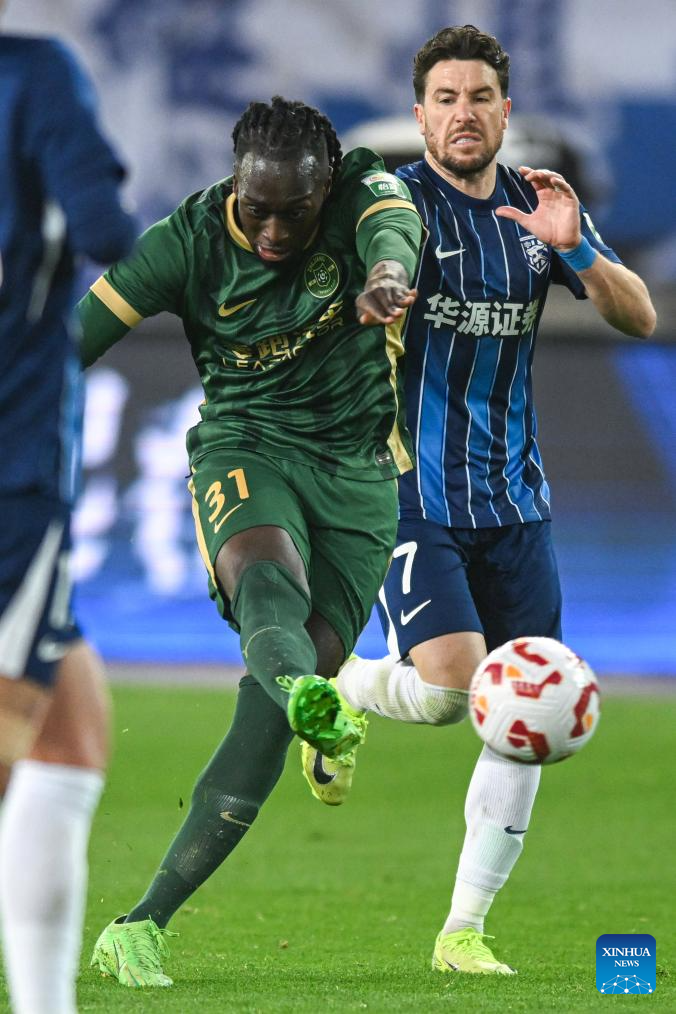 Deabeas Owusu-Sekyere (L) of Zhejiang Greentown FC shoots during the 3rd round match between Wuhan Three Towns FC and Zhejiang Greentown FC at the 2025 season Chinese Football Super League (CSL) in Wuhan, central China's Hubei Province, March 28, 2025. (Xinhua/Du Zixuan)