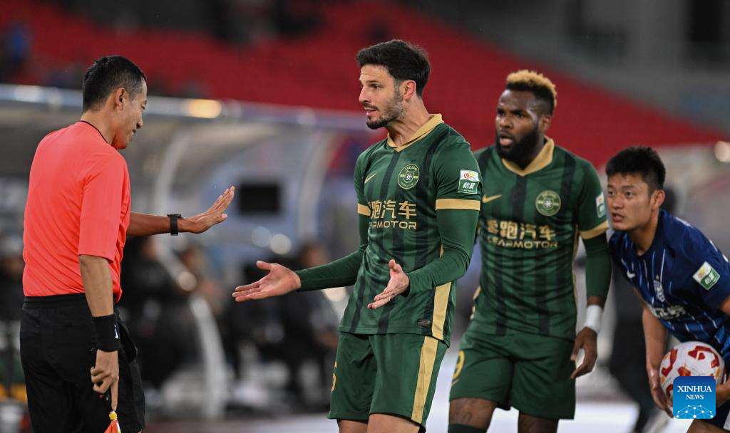 Lucas Possignolo (2nd L) of Zhejiang Greentown FC talks to referee during the 3rd round match between Wuhan Three Towns FC and Zhejiang Greentown FC at the 2025 season Chinese Football Super League (CSL) in Wuhan, central China's Hubei Province, March 28, 2025. (Xinhua/Cheng Min)