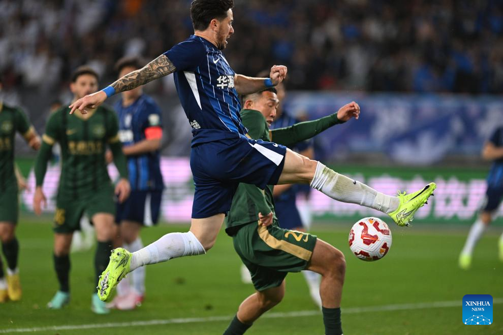 Gustavo Sauer (front) of Wuhan Three Towns FC competes during the 3rd round match between Wuhan Three Towns FC and Zhejiang Greentown FC at the 2025 season Chinese Football Super League (CSL) in Wuhan, central China's Hubei Province, March 28, 2025. (Xinhua/Cheng Min)