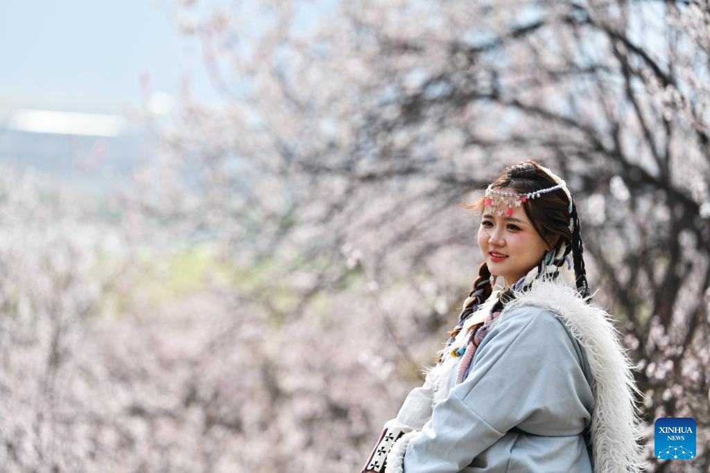 A tourist poses for photos in front of peach blossoms in Nyingchi, southwest China's Xizang Autonomous Region, March 29, 2025. As the weather warms up, peach blossoms in Nyingchi are in full bloom, attracting numerous tourists. (Xinhua/Qi Zhiyue)