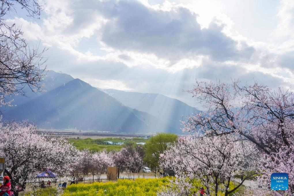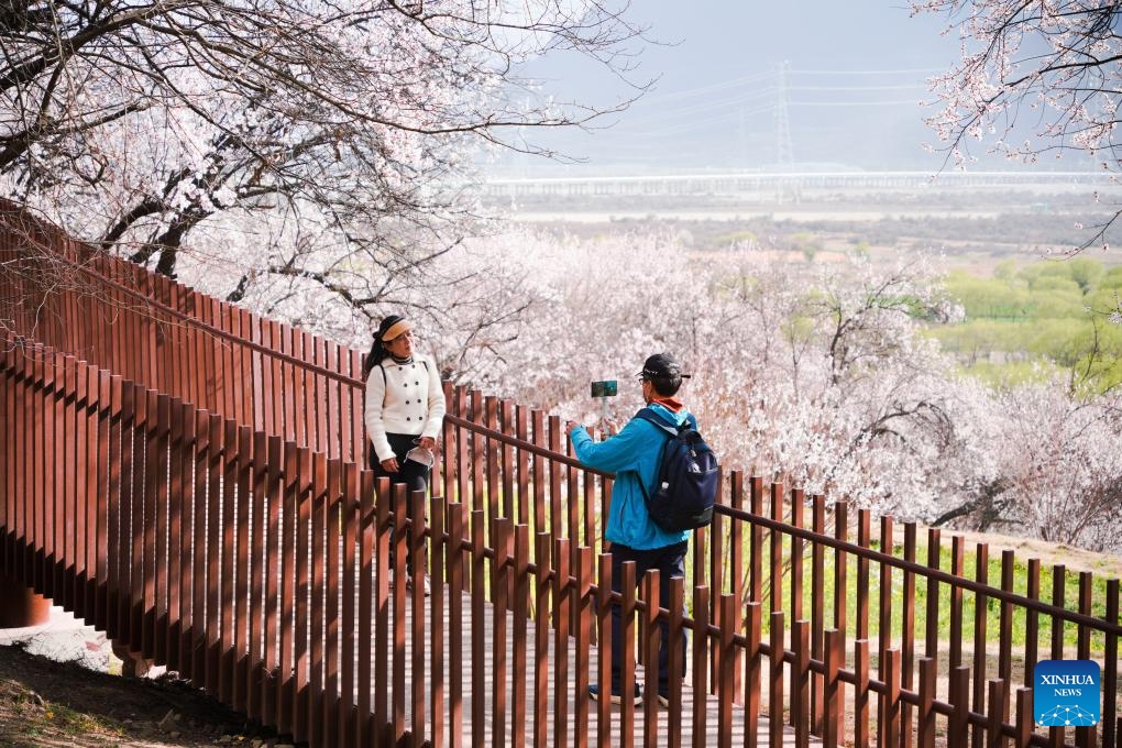 Tourists appreciate peach blossoms in Nyingchi, southwest China's Xizang Autonomous Region, March 29, 2025. As the weather warms up, peach blossoms in Nyingchi are in full bloom, attracting numerous tourists. (Xinhua/Qi Zhiyue)