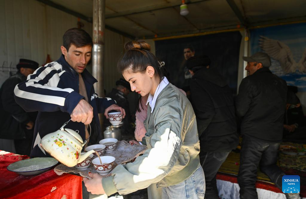 Amangul Wapik (R) and her brother prepare milk tea for guests in Sarijilga Village of Taxkorgan Tajik Autonomous County, northwest China's Xinjiang Uygur Autonomous Region, March 21, 2025. (Xinhua/Hu Huhu)