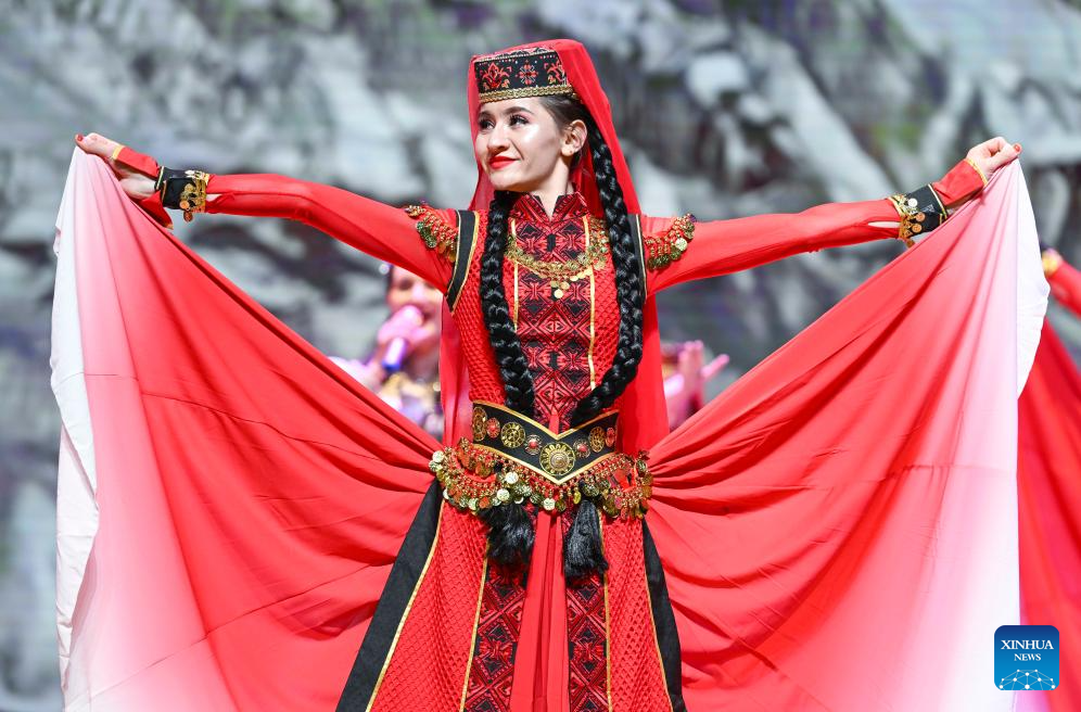 Amangul Wapik dances during a show at a performing art center in Taxkorgan Tajik Autonomous County, northwest China's Xinjiang Uygur Autonomous Region, March 23, 2025. (Xinhua/Hu Huhu)