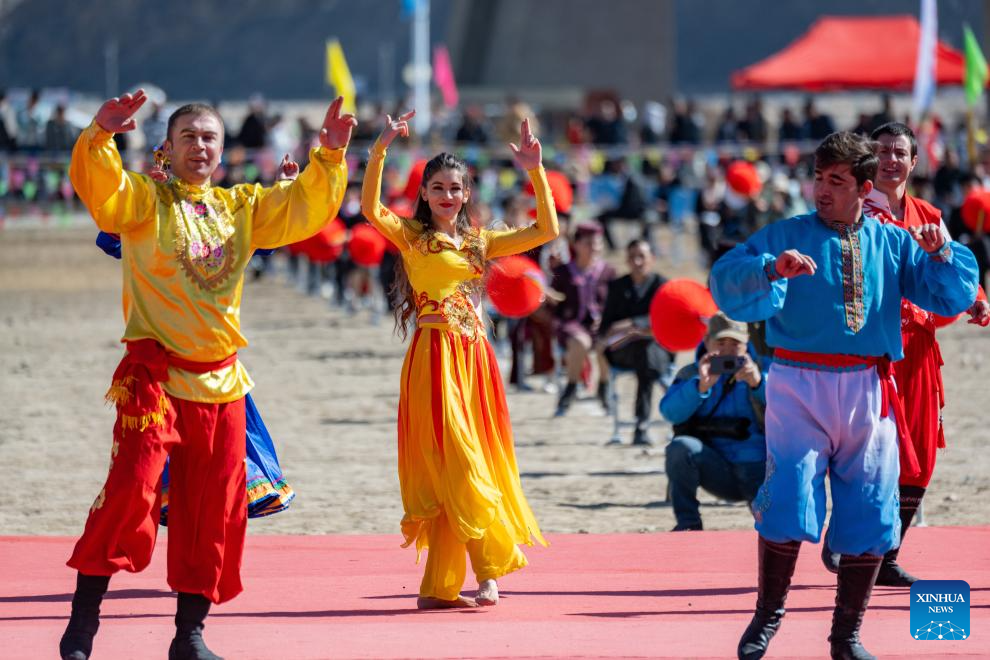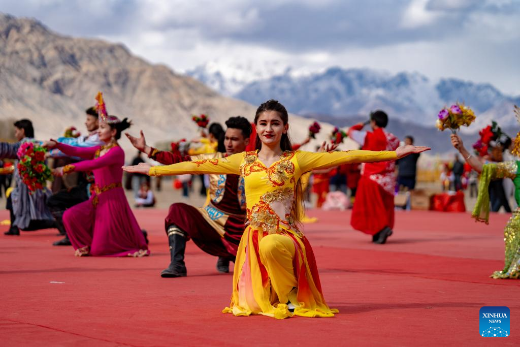 Amangul Wapik (C) and her colleagues stage a performance during a spring tourism activity in Tiznap Town of Taxkorgan Tajik Autonomous County, northwest China's Xinjiang Uygur Autonomous Region, March 23, 2025. (Xinhua/Hu Huhu)