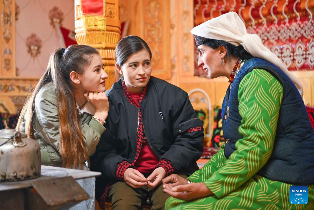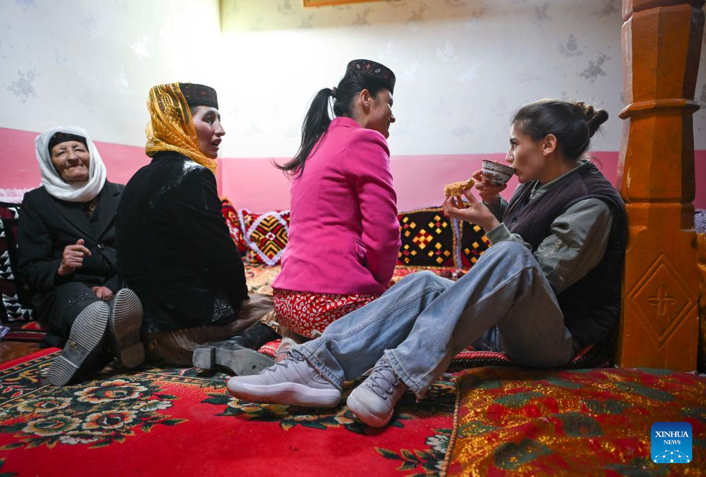Amangul Wapik (L) talks with her families in Sarijilga Village of Taxkorgan Tajik Autonomous County, northwest China's Xinjiang Uygur Autonomous Region, March 21, 2025. (Xinhua/Hu Huhu)