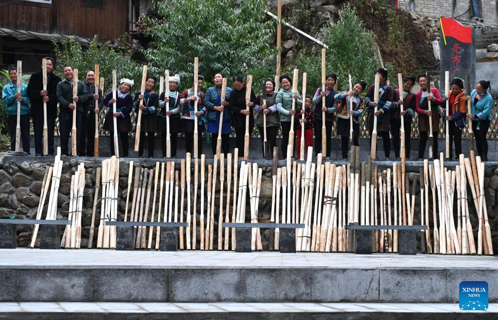 Children play Lusheng, a traditional reed-pipe wind instrument, in Wuying Village on the border between south China's Guangxi Zhuang Autonomous Region and southwest China's Guizhou Province, Oct. 5, 2024. Since 2017, supported by a paired assistance program, local authorities have continuously enhanced the living environment and improved cultural facilities in Wuying Village, aiming to strengthen the inheritance and development of ethnic culture and promote rural revitalization. (Xinhua/Huang Xiaobang)