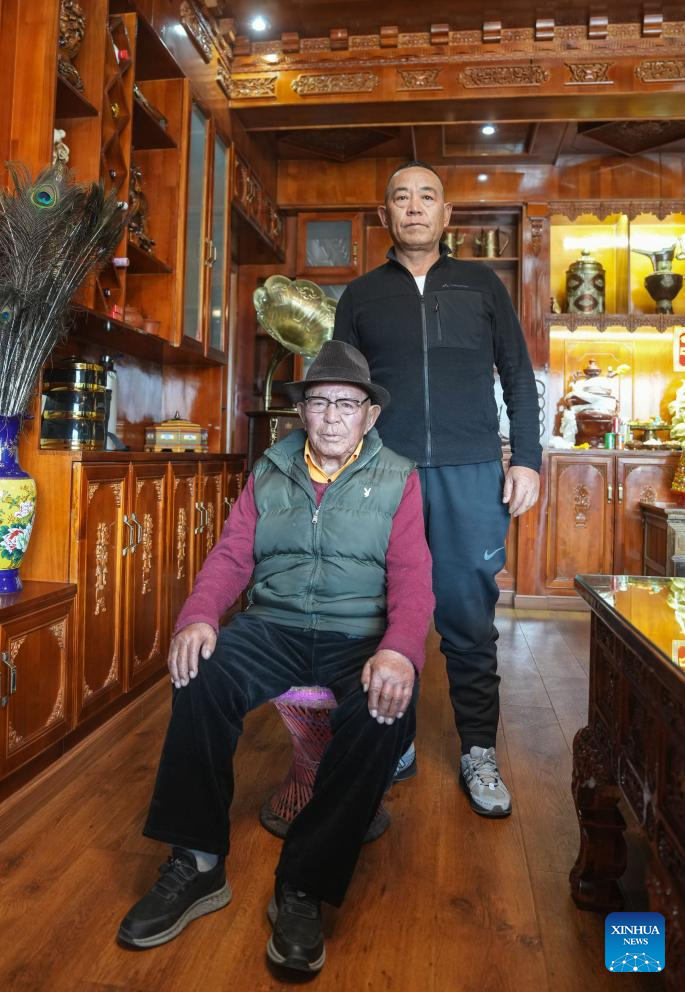 Losang's son serves tea to him at home in Doilungdeqen District of Lhasa, southwest China's Xizang Autonomous Region, March 20, 2025. (Xinhua/Jigme Dorje)