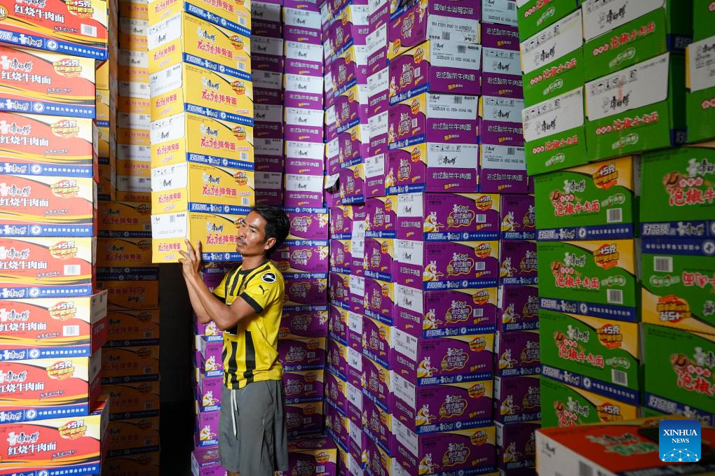 A worker carries boxes of instant noodles to be sent to Myanmar for earthquake relief in Ruili, southwest China's Yunnan Province, March 29, 2025. Yunnan Province has sent relief supplies to Myanmar on Saturday, after a massive earthquake jolted the Southeast Asian country on Friday. (Xinhua/Chen Xinbo)