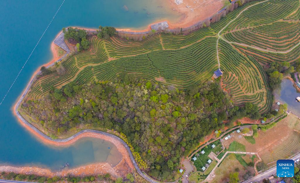 An aerial drone photo shows a Juyan tea planting base in Lutian Village in Jinhua City of east China's Zhejiang Province, March 31, 2025. The Wuzhou (ancient name of Jinhua) Juyan tea has recently entered its harvest season. The making technique of the Juyan tea, together with that of Longjing tea (West Lake Dragon Well tea), Changxing Zisun tea (a tea variety originated from Changxing County) and some other reputed tea varieties in Zhejiang, was inscribed on the World Intangible Cultural Heritage List in 2022.