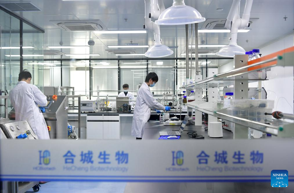 Technicians work in a lab at HeCheng Biotechnology Co., Ltd. in Feixi County of Hefei, east China's Anhui Province, March 31, 2025. In recent years, Feixi County has fostered the cluster development of emerging industries including new energy and intelligent connected vehicles, integrated circuits, advanced photovoltaic and energy storage, biomedicine, low-altitude economy, etc. to inject momentum into the county's high-quality economic development. (Photo by Xu Yong/Xinhua)