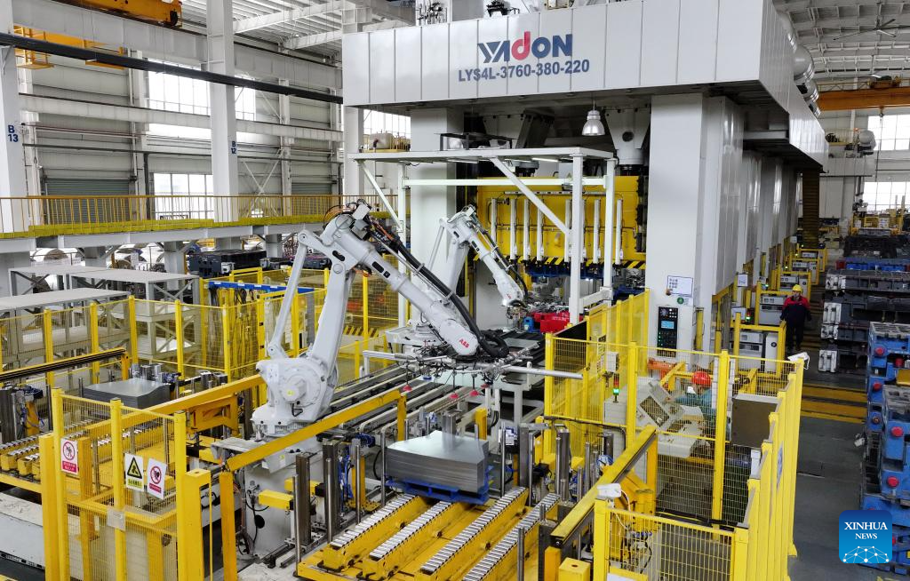 Robotic arms operate at a workshop of an auto parts manufacturing company in Feixi County of Hefei, east China's Anhui Province, March 31, 2025. In recent years, Feixi County has fostered the cluster development of emerging industries including new energy and intelligent connected vehicles, integrated circuits, advanced photovoltaic and energy storage, biomedicine, low-altitude economy, etc. to inject momentum into the county's high-quality economic development. (Photo by Xu Yong/Xinhua)