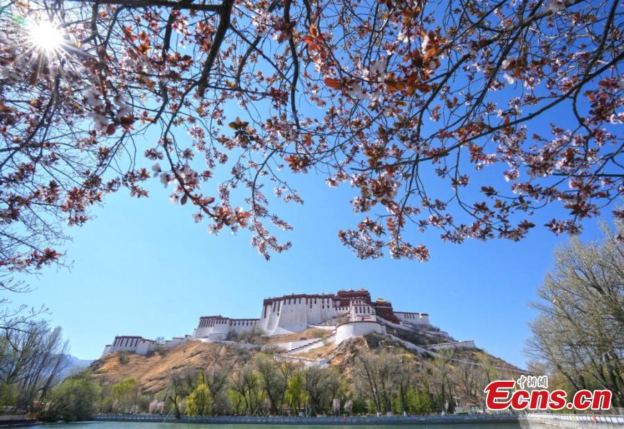 Potala Palace is surrounded by blooming flowers as spring comes in Lhasa, Southwest China's Xizang Autonomous Region, April 1, 2024. (China News Service/Li Lin)