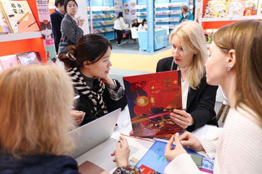 Exhibitors talk at the Chinese exhibition area during the 62nd Bologna International Children's Book Fair in Bologna, Italy, April 1, 2025. (Xinhua/Li Jing)