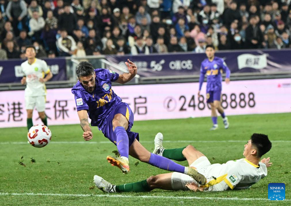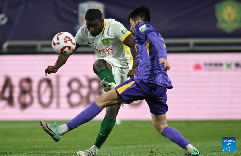 Dawhan (2nd R) of Beijing Guoan competes during the 4th round match between Tianjin Jinmen Tiger and Beijing Guoan at the 2025 season Chinese Football Super League (CSL) in north China's Tianjin, April 2, 2025. (Xinhua/Sun Fanyue)