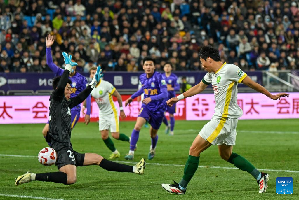 Li Lei (R) of Beijing Guoan shoots to score during the 4th round match between Tianjin Jinmen Tiger and Beijing Guoan at the 2025 season Chinese Football Super League (CSL) in north China's Tianjin, April 2, 2025. (Xinhua/Sun Fanyue)
