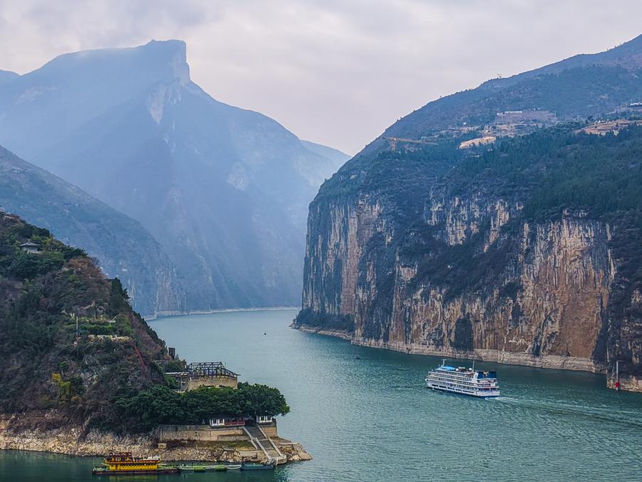 An aerial drone photo shows a cruise ship sailing in Qutang Gorge, one of the Three Gorges on the Yangtze River, in Fengjie County, southwest China's Chongqing Municipality, Feb. 13, 2025. (Xinhua/Wang Quanchao)