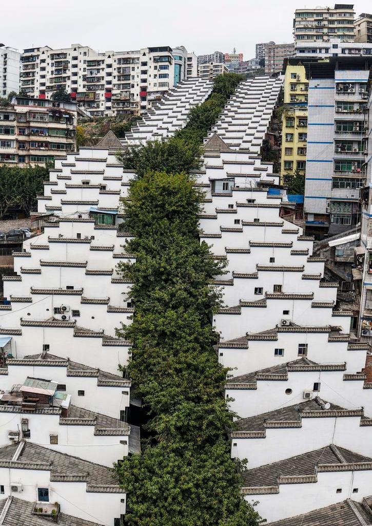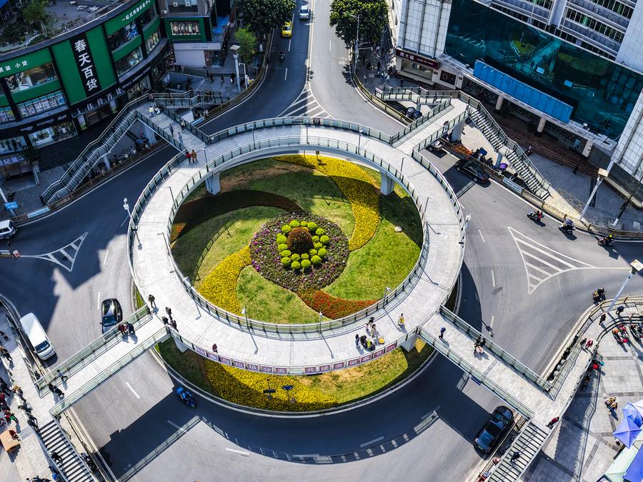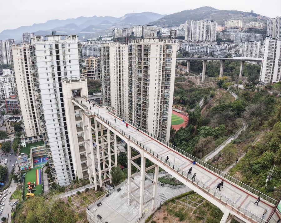 An aerial drone photo shows people walking on an overpass in Fengjie County, southwest China's Chongqing Municipality, Feb. 12, 2025. (Photo by Zhu Song/Xinhua)