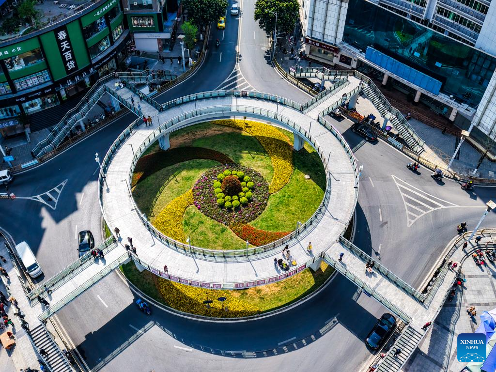An aerial drone photo shows people walking on an overpass in Fengjie County, southwest China's Chongqing Municipality, Feb. 12, 2025. (Photo by Zhu Song/Xinhua)