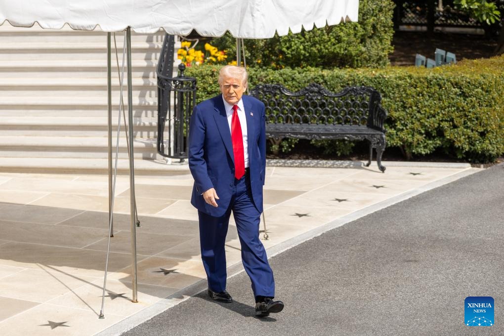 This photo taken on April 3, 2025 shows the U.S. President Donald Trump at the White House in Washington, D.C., the United States. Trump said on social media Friday that he would grant ByteDance an additional 75-day extension to either sell the popular video-sharing app TikTok to a non-Chinese company or risk being banned in the United States. (Xinhua/Hu Yousong)