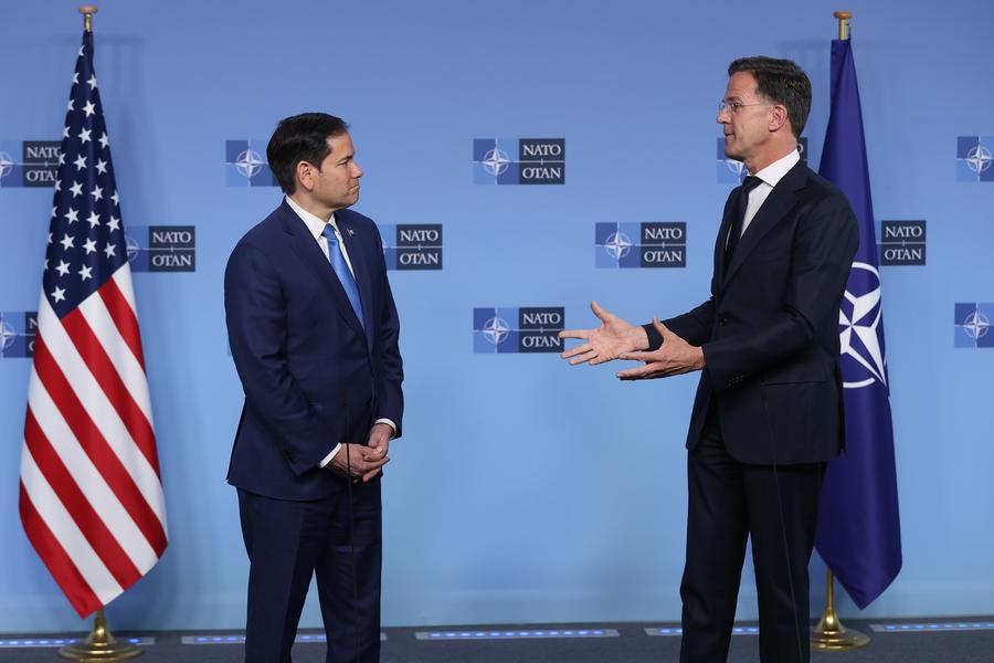 North Atlantic Treaty Organization (NATO) Secretary General Mark Rutte (R) and U.S. Secretary of State Marco Rubio meet the press during a NATO Foreign Ministers' meeting at the NATO headquarters in Brussels, Belgium, April 3, 2025. (Xinhua/Zhao Dingzhe)
