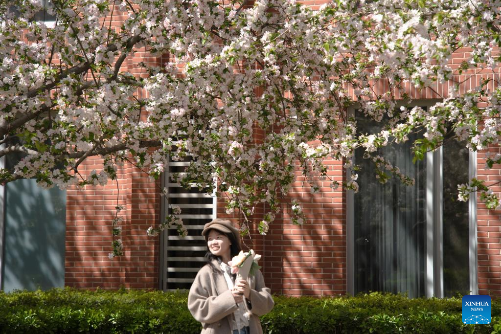 People enjoy flowers at the Zijingang campus of Zhejiang University in Hangzhou, capital of east China's Zhejiang Province, April 6, 2025. (Xinhua/Han Chuanhao)