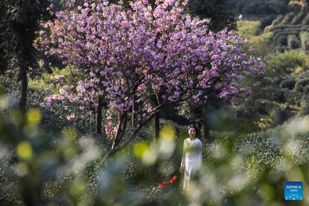 A tourist views cherry blossoms at a tea garden in Bashan Village, Fuyang District of Hangzhou City, east China's Zhejiang Province, April 6, 2025. Cherry trees in the vast tea plantations on the mountains in Baishan Village are in full bloom, which attract lots of tourists. (Xinhua/Xu Yu)