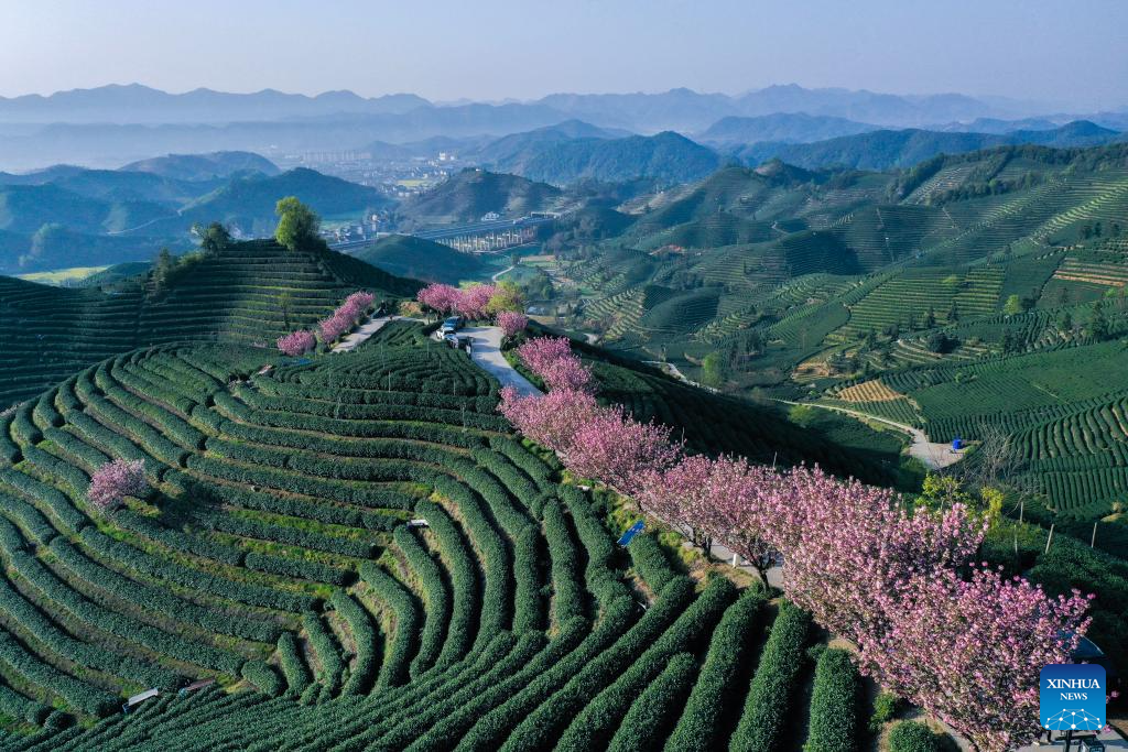 This photo taken on April 6, 2025 shows cherry blossoms at a tea garden in Bashan Village, Fuyang District of Hangzhou City, east China's Zhejiang Province. Cherry trees in the vast tea plantations on the mountains in Baishan Village are in full bloom, which attract lots of tourists. (Xinhua/Xu Yu)