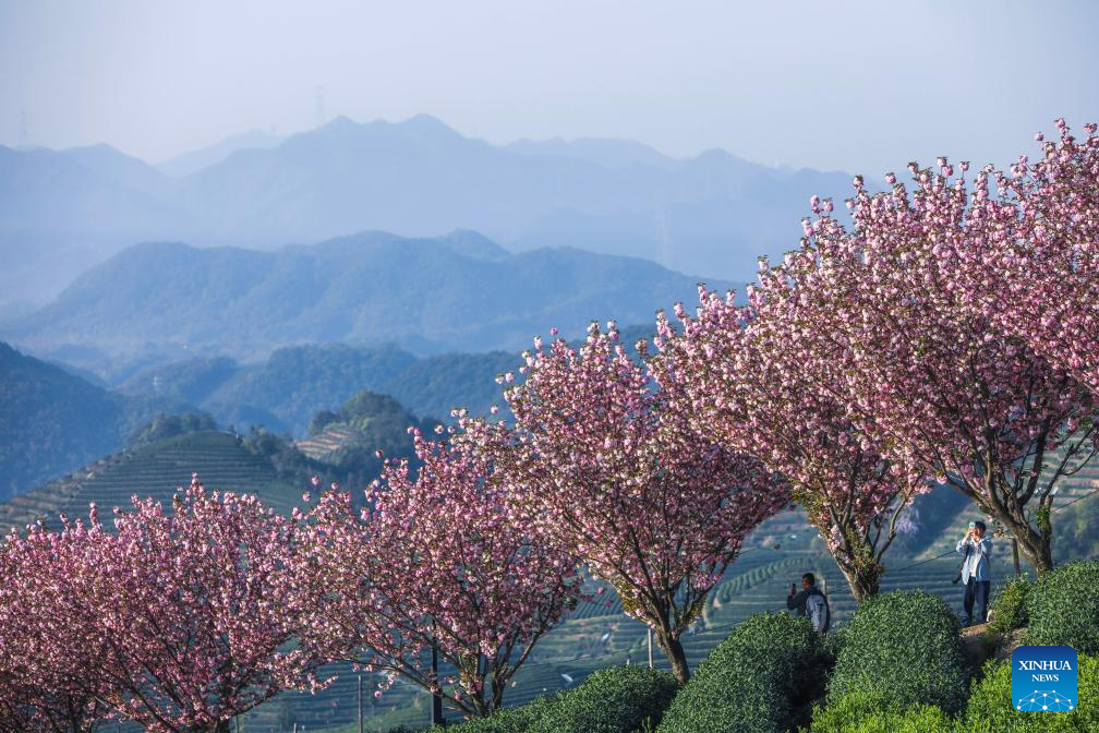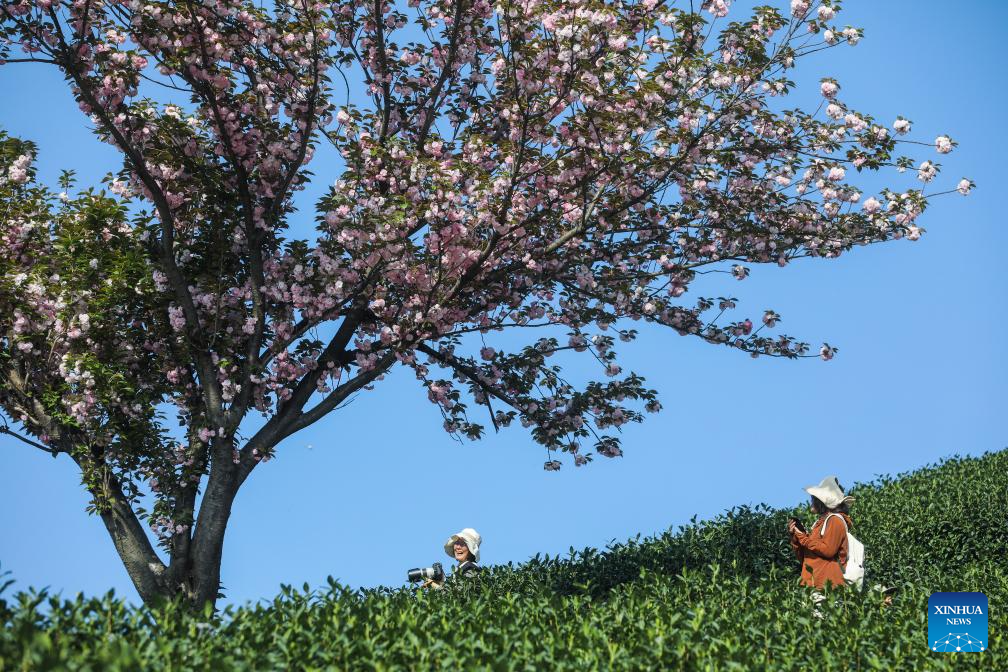 Tourists view cherry blossoms at a tea garden in Bashan Village, Fuyang District of Hangzhou City, east China's Zhejiang Province, April 6, 2025. Cherry trees in the vast tea plantations on the mountains in Baishan Village are in full bloom, which attract lots of tourists. (Xinhua/Xu Yu)