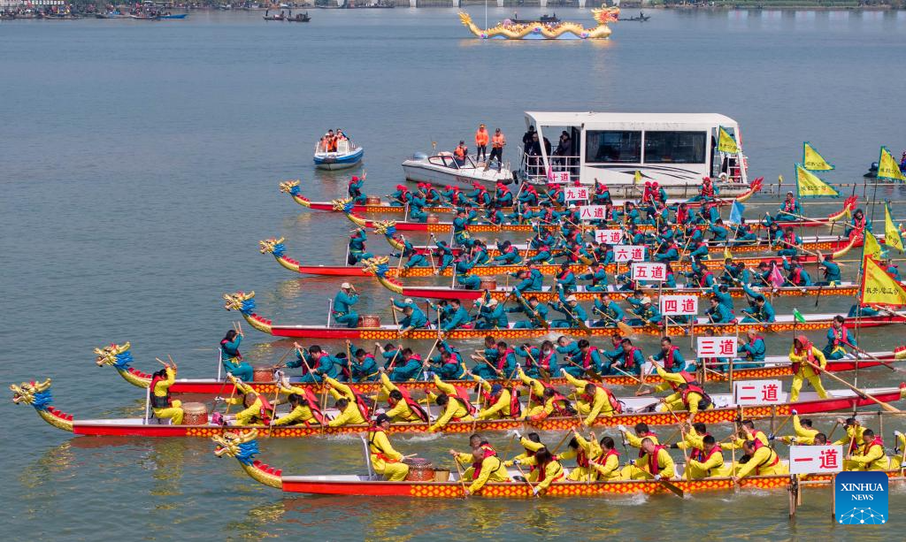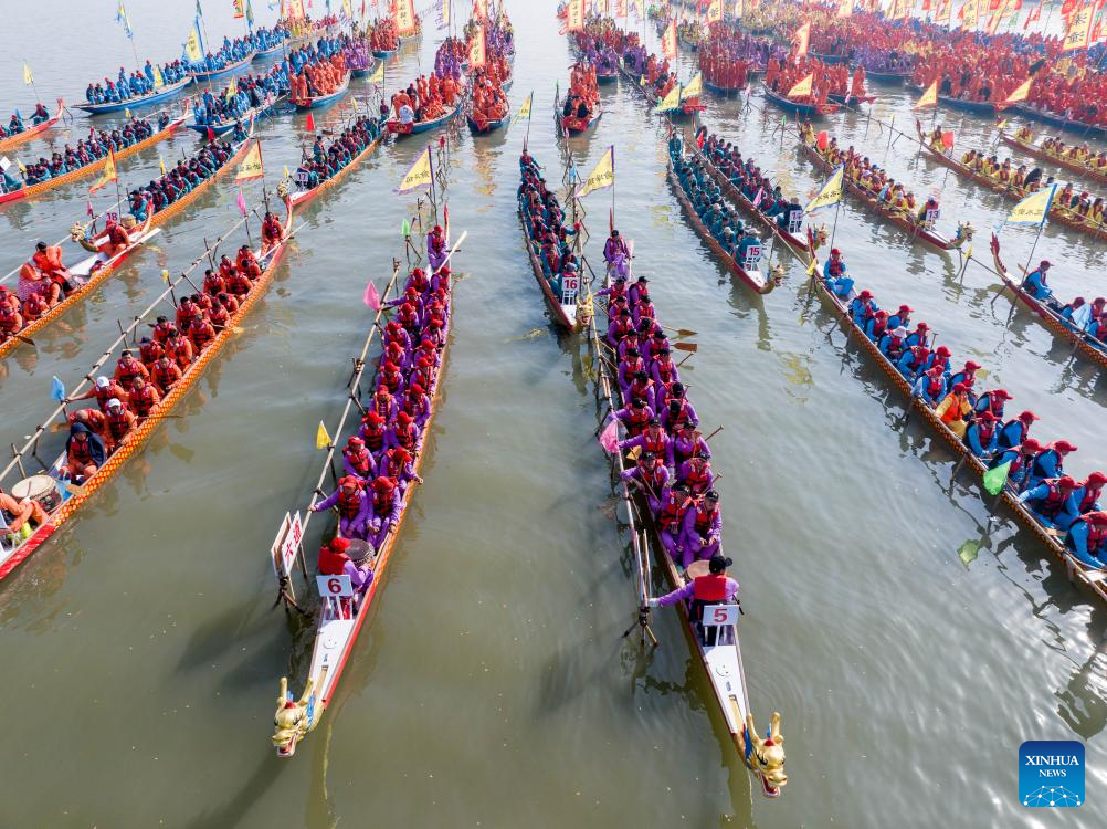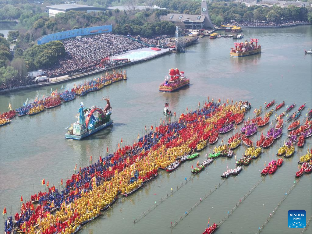 An aerial drone photo taken on April 6, 2025 shows a scene during the 2025 Qintong Boat Festival held at Qinhu National Wetland Park in Jiangyan District of Taizhou, east China's Jiangsu Province. Over five hundred boats with more than 10,000 boat team members aboard gathered here on Sunday for the Qintong Boat Festival, which has been a centuries-old tradition. The Qintong Boat Festival was listed as the state-level intangible cultural heritage in 2008. (Xinhua/Ji Chunpeng)