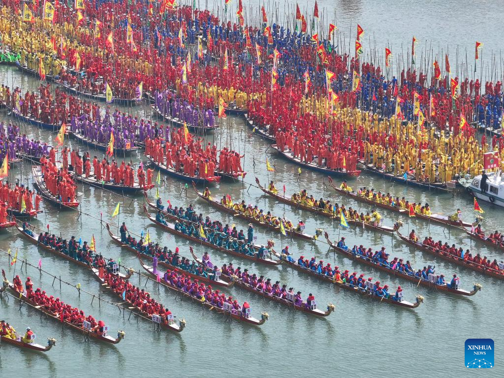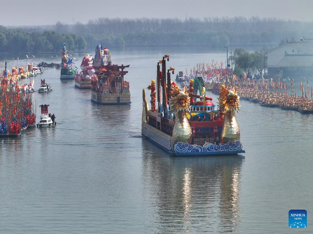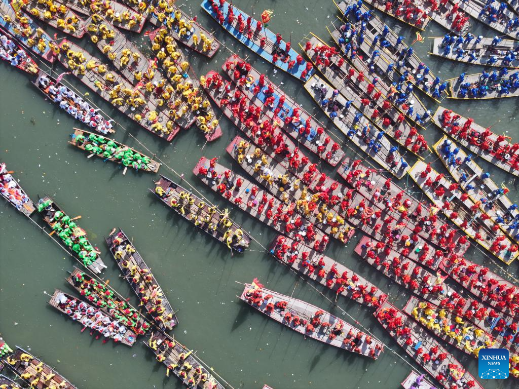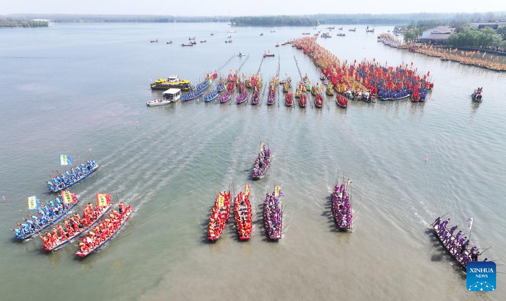 An aerial drone photo taken on April 6, 2025 shows people gathering for the 2025 Qintong Boat Festival held at Qinhu National Wetland Park in Jiangyan District of Taizhou, east China's Jiangsu Province. Over five hundred boats with more than 10,000 boat team members aboard gathered here on Sunday for the Qintong Boat Festival, which has been a centuries-old tradition. The Qintong Boat Festival was listed as the state-level intangible cultural heritage in 2008. (Xinhua/Ji Chunpeng)