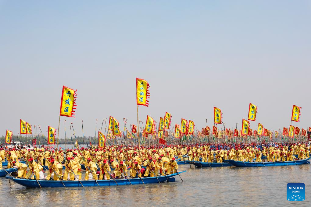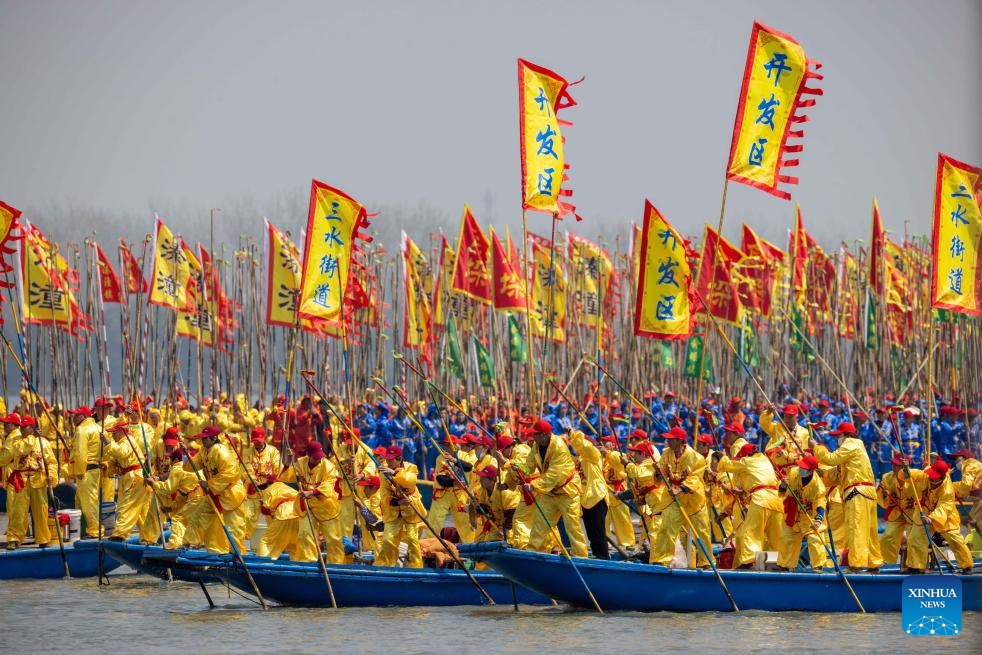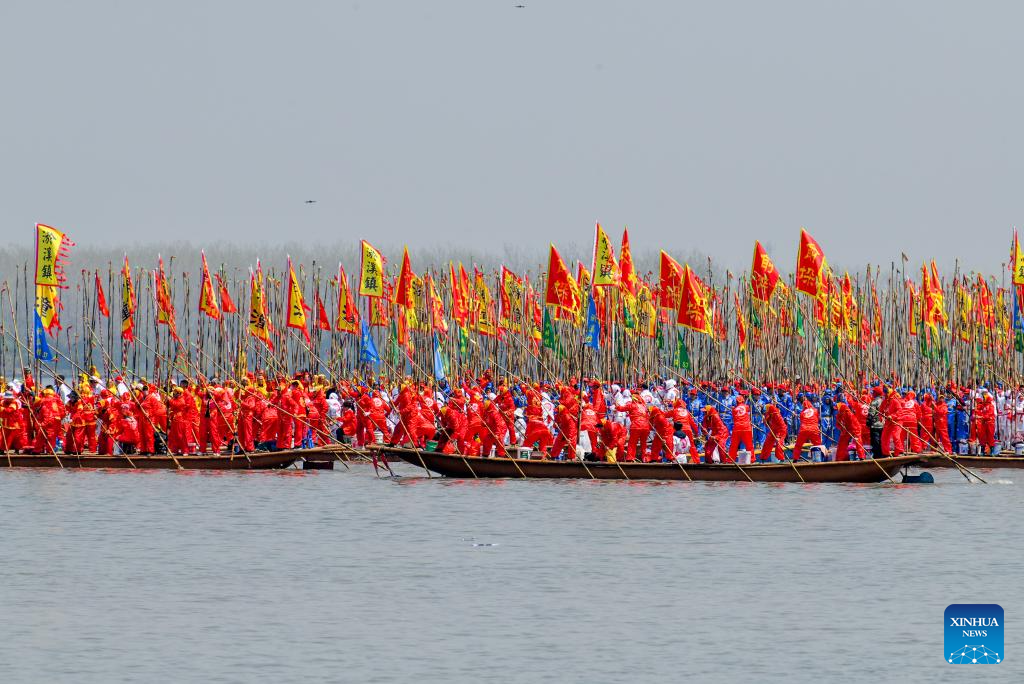 People participate in a boat performance during the 2025 Qintong Boat Festival held at Qinhu National Wetland Park in Jiangyan District of Taizhou, east China's Jiangsu Province on April 6, 2025. Over five hundred boats with more than 10,000 boat team members aboard gathered here on Sunday for the Qintong Boat Festival, which has been a centuries-old tradition. The Qintong Boat Festival was listed as the state-level intangible cultural heritage in 2008. (Photo by Yang Yugang/Xinhua)