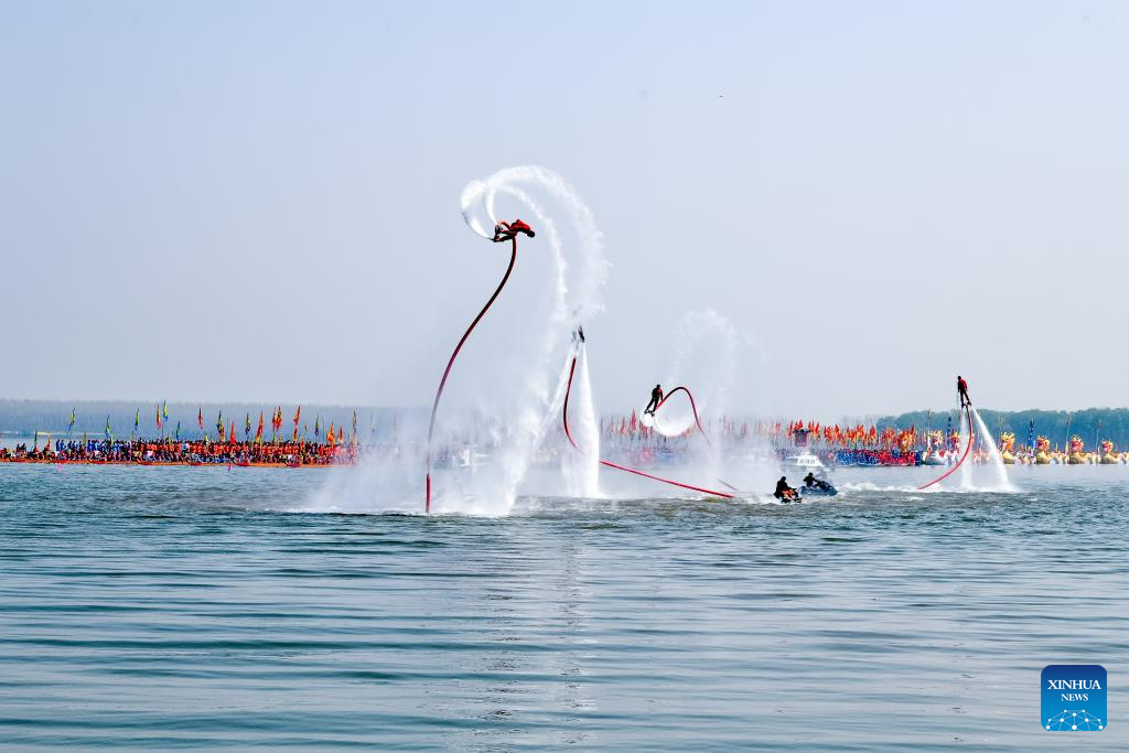 People participate in a boat performance during the 2025 Qintong Boat Festival held at Qinhu National Wetland Park in Jiangyan District of Taizhou, east China's Jiangsu Province on April 6, 2025. Over five hundred boats with more than 10,000 boat team members aboard gathered here on Sunday for the Qintong Boat Festival, which has been a centuries-old tradition. The Qintong Boat Festival was listed as the state-level intangible cultural heritage in 2008. (Photo by Tang Dehong/Xinhua)