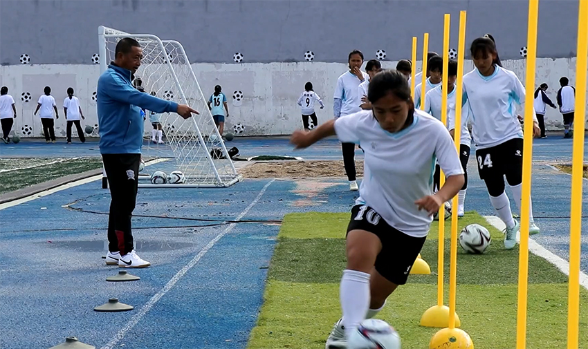 Photo shows head coach Zheng Xuefeng instructing the No. 1 Middle School girls' soccer team during practice in Honghe county, Honghe Hani and Yi Autonomous Prefecture, southwest China's Yunnan Province. (Photo courtesy of the Convergence Media Center of Honghe County)