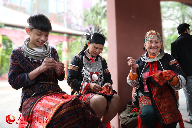 Artists preserving intangible cultural heritage weave Li brocade during a celebration of the Sanyuesan Festival, which falls on the third day of the third lunar month, in Qiongzhong city, south China's Hainan Province, March 30, 2025. (People's Daily Online/Fu Wuping)