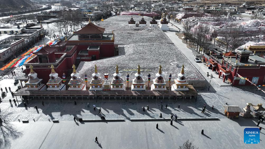 This aerial drone photo taken on April 6, 2025 shows a view of the Jiana mani stone mound in Yushu City, Yushu Tibetan Autonomous Prefecture, northwest China's Qinghai Province. The Jiana mani stone mound is a cultural relic under national protection. The mound is composed of billions of mani stones and used by local people when they hold prayers' wheels and mutter the six-syllable prayer to observe their daily ritual. (Xinhua/Zhang Long)