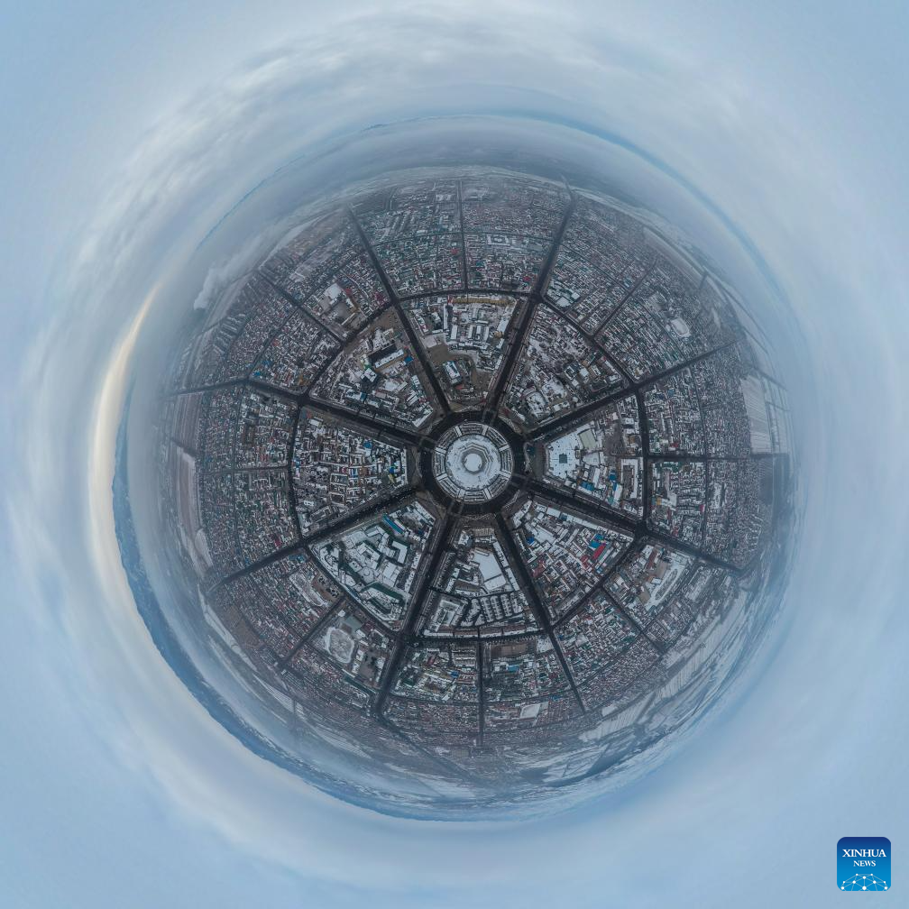 An aerial photo taken on Feb. 22, 2025 shows the central Tai Chi Plaza of Tekes County in Ili Kazak Autonomous Prefecture, northwest China's Xinjiang Uygur Autonomous Region.